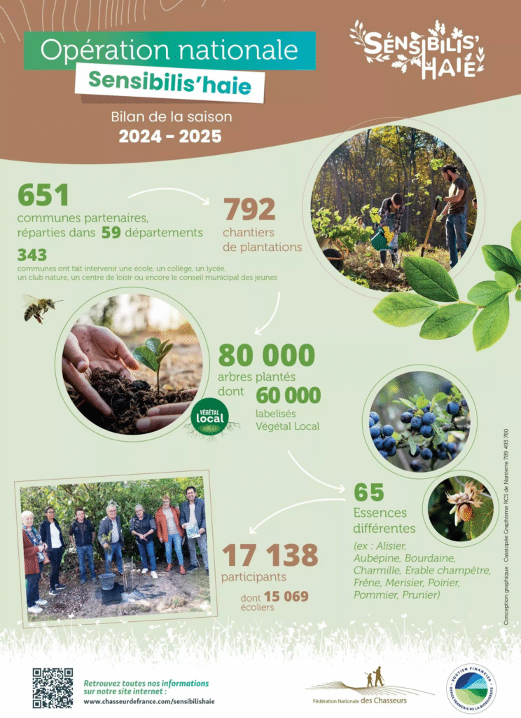 L’opération esxiste depuis trois ans et les résultats sont sans appel (voir visuel ci dessous). Ils montrent à quel point la haie, longtemps oubliée, retrouve aujourd’hui sa place essentielle dans les paysages ruraux et dans la conscience collective. Et ce n’est pas fini ! L’opération est renouvelée pour une 3ème saison consécutive. Dès maintenant, les communes peuvent se rapprocher de leur Fédération départementale des chasseurs pour rejoindre la campagne 2025–2026 et poursuivre ensemble cette belle dynamique au service de la nature et des territoires.
